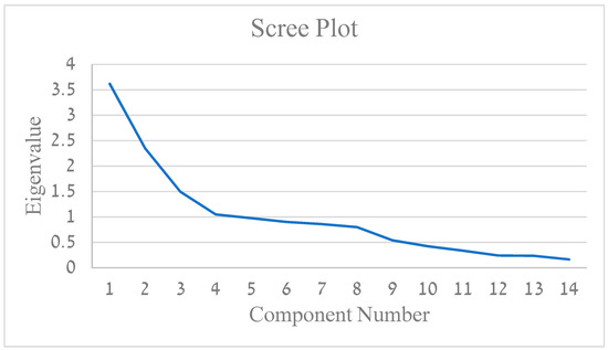 Using PCA, the Kaiser–Mayer–Olkin (KMO) index of the analysis was 0.599, p < 0.001. Using the varimax rotation method, three factors were identified, reaching a total explained variance of 51.76%. Factor loadings are displayed in Table 2. Figure 2 includes Eigenvalues for components of each of the 14 clinical behavior questions.