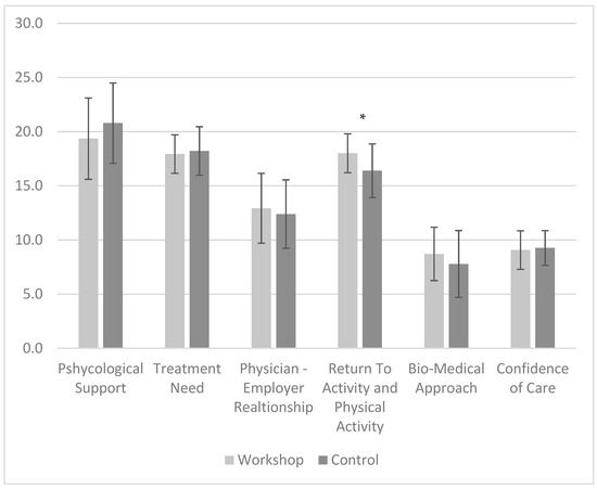 We aimed to determine whether a short ETMI intervention would impact physicians’ attitudes and change their beliefs regarding LBP treatment. The results of this study demonstrate a significantly higher ABS-mp return to physical activity recommendation score by physicians who attended the ETMI workshop (18 ± 0.48) compared to the control (16.4 ± 0.52). Despite its significance, this difference is higher than the Standard Error of Measurement (SEM) for this subscale (0.994) but lower than its minimal detectable change (MDC—90%) value of 2.31. Therefore, this finding should be interpreted with caution. However, the SEM was calculated from a physiotherapist’s sample and these psychometric values may differ between occupations, as the mean and standard deviation of the physiotherapist ABS-mp’s reactivation score was 17.72 ± 2.5.