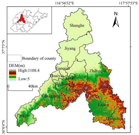 Jinan City is located in the central and western part of Shandong Province and at the southeastern edge of the North China Plain (116°21’~117°93’ E, 36°02’~37°54’ N). With a total area of 10,244.45 km2, it has jurisdiction over ten districts and two counties, (Figure 1), borders Mount Tai in the south and crosses the Yellow River in the north. Situated where the low mountains and hills in the south meet the alluvial plain in Shandong Province’s northwest, the terrain of Jinan is high in the south and low in the north, with 1100 m elevation difference between them. There are great disparities in natural resources’ endowment within Jinan’s territory. From south to north, it can be divided into the southern hilly and mountainous belt, the central piedmont plain belt, and the northern Yellow River belt. The mountain area in the south is a vital ecological barrier for Jinan, and even Shandong Province; the Yellow River in the north is a pivotal ecological corridor, and the north of the Yellow River is an invaluable grain production area. The limited space for urban development leads to the east–west strip layout characterizing Jinan’s main urban sector, which underpins an the imbalance between jobs and housing (as well as other problems); hence, it is popularly known as the “city of traffic jams”. With the construction of Jinan as a national central city and a zone for the replacement of old growth drivers with new ones, land use contradictions and conflicts are expected to worsen.
