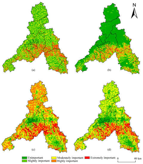 Spatial patterns of ecosystem service functions’ importance: (a) water conservation, (b) soil and water conservation, (c) biodiversity conservation, and (d) pooled ecosystem service functions.