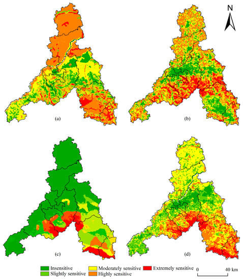 Spatial patterns of ecological sensitivity: (a) soil erosion sensitivity, (b) biodiversity sensitivity, (c) geological hazard sensitivity, and (d) ecological sensitivity.