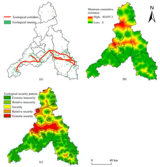 The ecological security pattern mainly consists of the ecological source, the minimum cumulative resistance surface, and the optimized ecological corridor network and its 200 m buffer zone []. Specifically, the minimum cumulative resistance surface was divided into five levels by the natural break method in ArcGIS 10.2: extreme insecurity, relative insecurity, security, relative security, and extreme security. Then, the ecological source area, optimized ecological corridor and its 200 m buffer were designated as areas having extreme security, and the final ecological security pattern of Jinan was thus obtained [].
