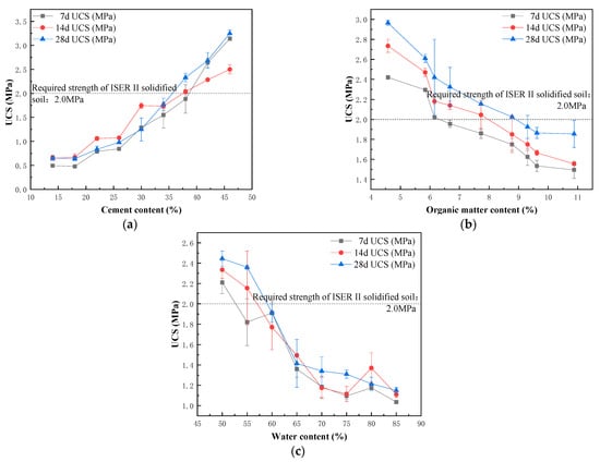 (a) Compressive strength of solidified block with different cement contents; (b) Compressive strength of solidified block with different organic matter contents; and (c) Compressive strength of solidified block with different water contents.