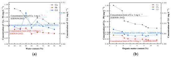 (a) Heavy metal leaching concentration with different water content; (b) Heavy metal leaching concentration with different organic matter content; and (c) Heavy metal leaching concentration with different cement content.