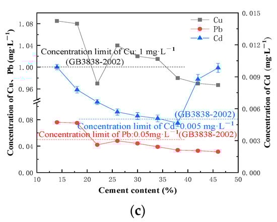 Figure 2c shows the relationship between the leaching concentration of heavy metals and the amount of cement added. With more cement added, the leaching concentration of Cd (p < 0.05; r = −0.731), Cu (p < 0.05; r = −0.753), and Pb (p < 0.01; r = −0.882) shows a downward trend. When the cement content reaches 38%, the decline of the leaching concentration of heavy metals begins to slow down. Higher cement content brings about more intensive solidification reactions. Loose soil particles are cemented into larger soil aggregates to form a more compact soil structure, which helps adsorb and fix heavy metals in the solid phase []. However, with excessive cement, the generated gel materials are connected with each other, thus reducing the adsorption of heavy metals and resulting in the slowing down of the decline of heavy metal leaching concentration []. When the cement content is higher than 38%, the content of Cd, Cu, and Pb in the leaching solution of the solidified soil conforms to the Class III limit value specified in the Environmental Quality Standard for Surface Water (GB3838) [].