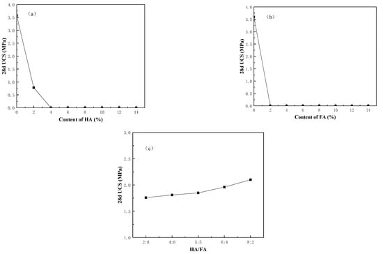 Figure 3 shows the relationship between the content of humic acid and fulvic acid, the HA/FA ratio (the total content of humic acid and fulvic acid is controlled at 1%), and the UCS of solidified soil. It can be seen from the Figure that when the content of humic acid and fulvic acid increases, respectively, the compressive strength of the solidified soil sharply decreases. When the content of humic acid reaches 4%, the compressive strength of solidified soil decreases to 0, and when the content of fulvic acid reaches 2%, the compressive strength of solidified soil decreases to 0. The reason for this is that humic acid has a strong chemical affinity and selectivity for calcium ion (Ca2+) and it reacts with hydrated lime [Ca (OH) 2], forming insoluble substances adsorbed on the surface of cement and clay particles that disturb the hydration and pozzolanic reaction []. At the same time, acid ions will decompose the cement hydration products and the cementation formed by other reactions, destroying the cementation body and the solidified skeleton of solidified silt, thus affecting the compressive strength of the solidified soil []. The molecular weight of fulvic acid is small and the acidity is stronger. Compared with Figure 3a,b, fulvic acid has a more significant weakening effect on the compressive strength of solidified soil than humic acid. It can be seen from Figure 3c that the strength of solidified organic soil changes linearly with the increase in the HA/FA ratio, and gradually increases with the increase in the HA/FA ratio. When the HA/FA ratio is less than one, fulvic acid plays a leading role, with low strength of the solidified organic soil and small slope of the reinforcement curve. When the HA/FA ratio is greater than one, the strength of the solidified organic soil is improved and the slope of the strength growth curve is large, indicating that the main material that has an adverse impact on the curing strength is fulvic acid.