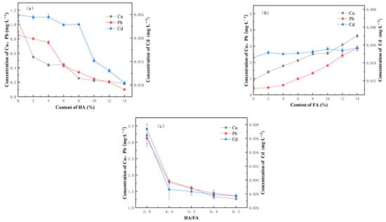(a) Effect of humic acid on heavy metal leaching; (b) Effect of fulvic acid on heavy metal leaching; and (c) Effect of HA/FA ratio on heavy metal leaching.