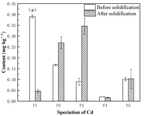 Previous studies [,,] have found that heavy metals will combine with OH− or silicate and solidify in calcium salt when mixed with cement-based materials, and they can also be adsorbed in C-S-H gel to enter the crystal structure. Pb can usually be adsorbed on the surface of hydration products. Most CuO will participate in hydration to form Cu-Ca-Si minerals, and Cd will replace calcium ions in the calcium oxide layer and interlayer structure of C-S-H gel. The speciation of heavy metals in soil or sediment can be divided into exchangeable (F1), carbonate-bound (F2), iron-manganese oxidized (F3), organic-bound (F4) and residual (F5), according to Tessier’s five-step extraction method. From Figure 5, it can be seen that Cd in the experimental sediment before solidification mainly exists in the form of F1 and F2, with contents of 0.39 mg/kg and 0.17 mg/kg, respectively, accounting for 50.65% in F1 and 22.08% in F2. Cu mainly exists in the form of F2 and F4, with the content of F2 standing at 92.75 mg/kg, accounting for 50.81%, and the content of F4 standing at 40.18 mg/kg, accounting for 22.01%. Pb mainly exists in the form of F2 and F3. Heavy metal leaching is closely related to the distribution of speciation [], especially the unstable F1, F2, and F3. F1 is mobile and can be easily absorbed by organisms, featuring direct biological toxicity. It can be seen in the figure that the experimental sediment before solidification has a high potential risk to the environment. After curing, the F1 content of Cd decreases, while the F2 and F3 content increases. The F2 content of Cu and Pb decreases and the F3 content increases. It can be seen that the exchangeable states of Cd, Cu, and Pb are reduced to varying degrees after solidification, which indicates that solidification reduces the leaching ability of Cd/Cu/Pb, which is of great significance for the reduction in heavy metal toxicity.