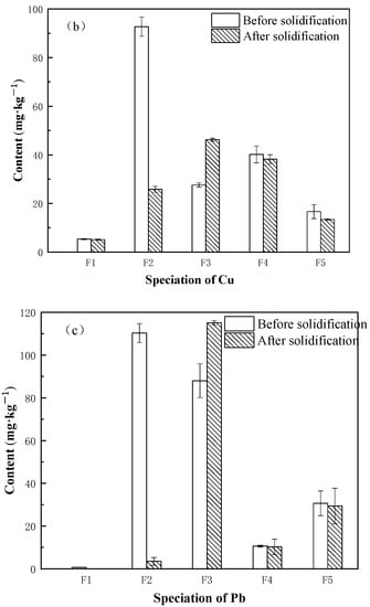 (a) Speciation changes of Cd before and after solidification; (b) Speciation changes of Cu before and after solidification; and (c) Speciation changes of Pb before and after solidification.
