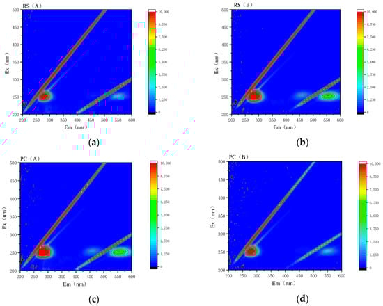 The three-dimensional fluorescence spectrum of humus extracted from the sediment before and after solidification is shown in Figure 6. The three-dimensional fluorescence spectrum can help obtain the fluorescence intensity information when the emission wavelength and excitation wavelength change simultaneously, so as to infer the configuration change of humus [].