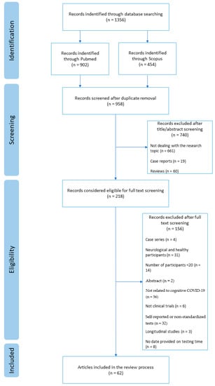 A total of 1356 articles were retrieved through database searching. After the removal of 398 duplicates, a total of 958 articles remained, out of which 661 articles were excluded by title or abstract for not dealing with our research topic, 19 were removed as reporting case series, and 60 were excluded as referring to reviews. A total of 218 articles were considered eligible for the study. After full text screening, another 156 articles were removed since four were single cases, 31 mixed neurological with healthy participants, 14 included less than 20 participants, two had only the abstract available, 56 were not related to cognitive sequelae of COVID-19, six were not clinical trials, 32 did not include standardized tests, three were longitudinal studies, thus, it was not possible to individuate a precise period of testing time, and eight did not report the time of testing (see Figure 1).