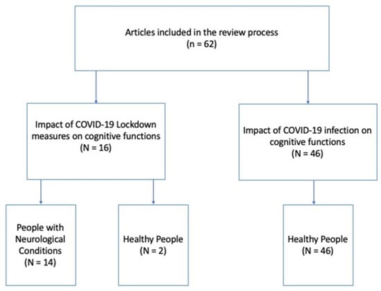 The selected 62 articles were rearranged according to the two principal aims of the review: (1) studies on the impact of COVID-19 lockdown measures on the cognitive functions (N = 16) of, respectively, (1a) people with neurological conditions (N = 14) and (1b) healthy people (N = 2); and (2) studies on the impact of COVID-19 infection on cognitive functions (N = 46). No studies on people with neurological conditions met our inclusion criteria in this category; thus, all studies in this category referred to healthy people (N = 46; see Figure 2). Finally, for each category, studies were organized into three further subgroups according to the time elapsed between the testing and the beginning of lockdown measures or COVID-19 infection: short-term period (1–4 months), medium-term period (5–8 months), and long-term period (9–12 months; see Table 1 and Table 2).