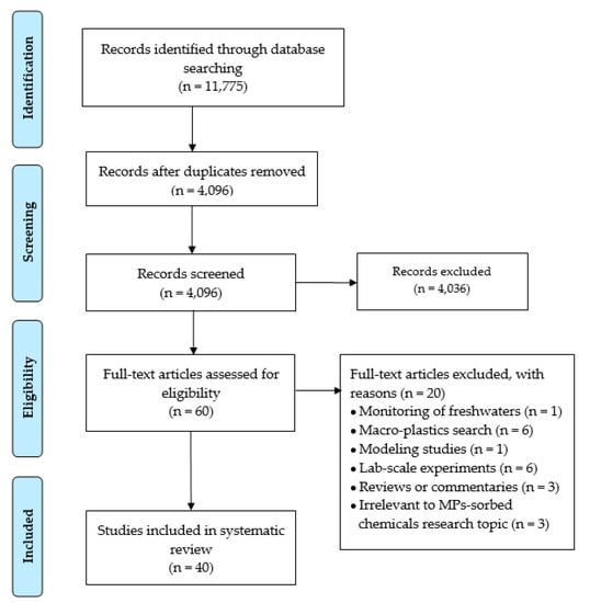 The systematic review was conducted in accordance with the Preferred Reporting Items for Systematic reviews and Meta-Analyses (PRISMA) guidelines []. The literature search was conducted on 30 December 2022 using three online databases (PubMed, Web of Science, and Scopus) without time limitations. The query used for the search included (microplastic OR plastic debris) in combination with the following keywords: HOCs, POPs, PAHs, PAEs, EDCs, pesticides, personal care products, per- and polyfluoroalkyl substances, hydrophobic chemicals, additives, plasticizer, vehicle, and marine. The database search provided 11,775 hits: 6013 hits from Pubmed, 1337 hits from Web of Science, and 4425 hits from Scopus. These articles were collected and duplicates were removed. The papers were screened based on the title and abstract for three criteria and were required to meet each of them for the inclusion: (i) monitoring studies focusing on organic pollutants adsorbed by MPs in either coastal areas or on sandy beaches; (ii) peer-reviewed research articles or technical reports providing monitoring data; and (iii) written in English. The paper selection was performed by two researchers. Papers that were considered relevant were retained for a full reading. A total of 60 original articles were read in full and then 20 papers were removed with reason, as reported in Table S1. In total, 40 studies met the selection criteria and were included in this review [,,,,,,,,,,,,,,,,,,,,,,,,,,,,,,,,,,,,,,,] (Figure 1).
