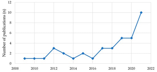 The included papers (n = 40) are summarized in Table S2. Their time-trend shows a strong increase after 2017 (Figure 2) and notably in 2019 when the World Health Organization published a report entitled MPs in Drinking Water [], which plausibly attracted greater attention from researchers worldwide. Therefore, the overall trend of interest in this topic is on the rise and the decline during 2022 (only two papers) may be attributable to the low productivity of researchers during the COVID-19 pandemic, especially in fields which rely on physical laboratories and time-demanding experiments (e.g., biochemistry, biosciences, chemistry) [,] as well as field sampling-based data collection []. Regarding the location of the reviewed studies, most of them were carried out in China (12 papers, 30%), followed by Japan (7 papers, 17.5%), and Spain (5 papers, 12.5%) (Figure 3).