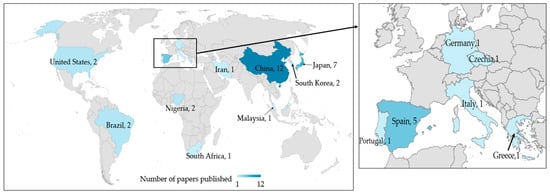Geographical distribution of the reviewed papers (the number near the country name refers to the number of papers).