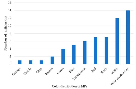Distribution of MPs color in the reviewed studies (some papers reported more than one color).