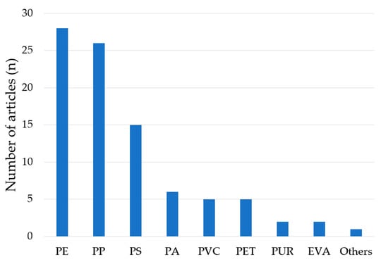 Polymer type reported in the reviewed papers (EVA = ethyl vinyl acetate; PA = polyamide; PE = polyethylene; PET = polyethylene terephthalate; PP = polypropylene; PS = polystyrene; PUR = polyurethane; PVC = polyvinylchloride. Others refer to a very low percentage of polymer types reported in only one article or mentioned in studies only as “others”).