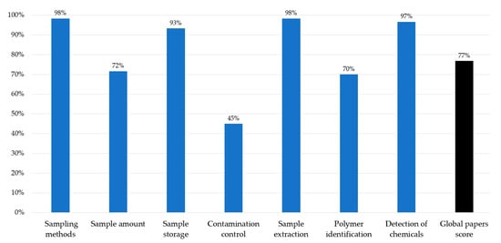 Likewise, control measures against contamination have been frequently applied in the reviewed papers (n = 38, Table S3). In particular, such measures consisted of one (or a combination) of the following approaches: (i) use of non-plastic materials (e.g., aluminum foil) to cover samples, (ii) use of pre-cleaned sampling tools and laboratory equipment (e.g., washing with ethanol, methylene chloride, or deionized water), (iii) work under clean conditions to minimize contamination in the laboratory (e.g., cleaning the laboratory in advance), (iv) wearing clothing and gloves that are non-synthetic or free from the target chemicals, and avoiding contact with any plastic materials (e.g., cotton lab coat), and (v) storing samples in clean containers (e.g., glass vials), or in amber or brown bottles to prevent the possible degradation of the sample.