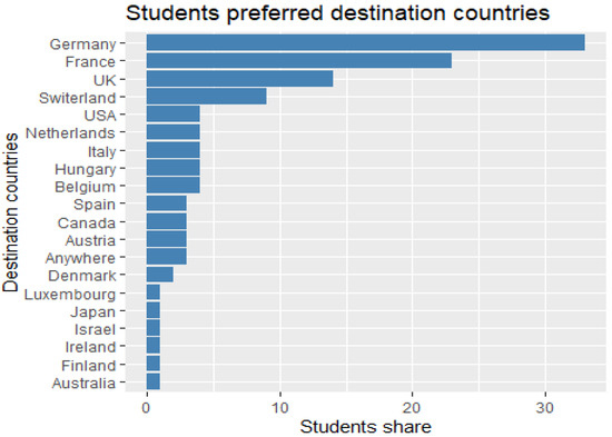 11]. Thus, among the preferred destination countries we found Germany (more than 30% of the respondents want to continue their studies there), France (23%) and the United Kingdom (14%), and 3% of the respondents would go anywhere just to leave Romania (