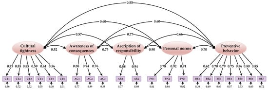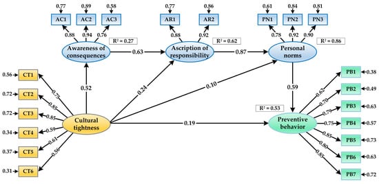 We followed the two-step strategy suggested by Anderson and Gerbing to test both the reliability and validity of the measurement model and to examine the hypothesized relationships in this study via structural equation modeling (SEM) with a maximum-likelihood estimation approach []. Both absolute fit indices and incremental fit indices were adopted to evaluate the goodness-of-fit of the model. The former included ratio of chi-square to the degree of freedom (χ2/df ≤ 5), goodness-of-fit index (GFI ≥ 0.90), standardized root mean square residual (SRMR < 0.08), and root mean square error of approximation (RMSEA < 0.08). The latter included incremental fit index (IFI ≥ 0.90), comparative fix index (CFI ≥ 0.90), and Tucker–Lewis index (TLI ≥ 0.90). However, given that χ2/df was sensitive to sample volume [], and when all the 3693 responses are involved in the analysis, the values of GFI, RMSEA, SRMR, IFI, CFI, and TLI may present a more rational and appropriate criterion to judge model fit []. We further ran a bootstrapping analysis with 2000 iterations to generate bias-corrected estimates of the indirect influences of cultural tightness on COVID-19 preventive behavior (via the chain mediation of awareness of consequences, ascription of responsibility, and personal norms) and their corresponding 95% confidence intervals (CIs). If a 95% CI for an indirect effect does not cover 0, it can be concluded that the mediation effect tested is statistically significant at the 0.05 level. All statistical analyses were processed based on the Amos 26 statistical package.
