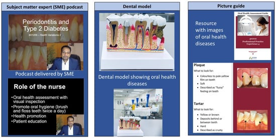 Based on the completion of the six steps, the resultant oral healthcare intervention included the use of a case study without diagnosis in the theoretical subject, followed by a self-reflection activity and whole-class discussion (see Supplementary Document S1). Subject-matter-expert-led podcasts were created based on the theoretical aspects of periodontitis and type 2 diabetes mellitus due to the bidirectional relationship of these conditions, with periodontal treatment improving glycaemic control. The selection of this content was part of a suite of education to be delivered to undergraduate nursing students across multiple subjects. Prior to the education being delivered in this chronic disease subject, the nursing students had completed oral healthcare training in a first-year primary healthcare subject. These podcasts were made available on the Blackboard learning site. Practice quiz questions as knowledge checks were also included. For the practical subject, teaching and learning activities included the use of dental models, a video or tutor demonstration of an oral health assessment and simulated practice of an oral health assessment. The final resource that was developed as a learning activity in the practical subject was a picture guide of the different dental pathologies included in the oral health assessment, such as caries and receding gums (Table 1 and Figure 2).