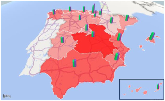 Given the extent and density of the abovementioned regulations, we tried to summarize them in Figure 1 and Figure 2. Figure 1 shows the regional situation of nursing homes in 2020. The areas shaded in red indicate the degree of regional regulation. For this purpose, 13 binary variables were defined, taking the value one if, for each region, there was a specific regulation in the following aspects: minimum surface area of dining rooms, kitchens, and living rooms; mandatory hairdressing area, visiting room, wake chapel/mortuary, elevator, and cranes; sociocultural activities program; room customization; the ratio of nurses and ratio of physicians. All these variables were then summed up in a single indicator that summarized the degree of regulation in logistics and human resources of the residences for each region. The greater the intensity of the red color (for example, Castilla La Mancha), the greater the regulation, and the lesser the intensity (for example, Aragón and Navarra), the greater the degree of freedom. On the other hand, the green and purple bricks represent the price (EUR/year) of a place in a public and subsidized nursing home in 2020. The difference between both was in the management, since public places correspond to social services, while subsidized ones correspond to private residences, where several places are reserved for public social services.