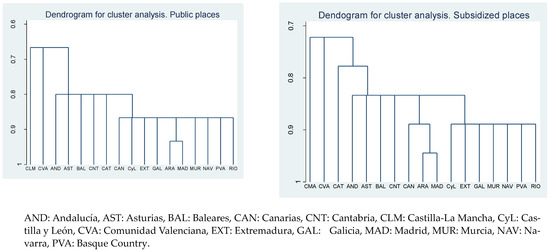 Figure 3 shows two dendrograms for public and subsidized places using as explanatory variables: prices, coverage ratios, binary variables related to all requirements (facilities and human resources), and GDPpc. In both dendrograms, we highlighted: (i) Castilla León, Extremadura, Galicia, Murcia, Navarra, Basque Country, and La Rioja were in the same group; (ii) within the previous group, Aragón and Madrid formed a subgroup of their own; (iii) Andalucía, Asturias, Baleares, and Cantabria formed a group with an intermediate level of similarity; (iv) Castilla La Mancha and Comunidad Valenciana were not integrated with any of the previous groups.