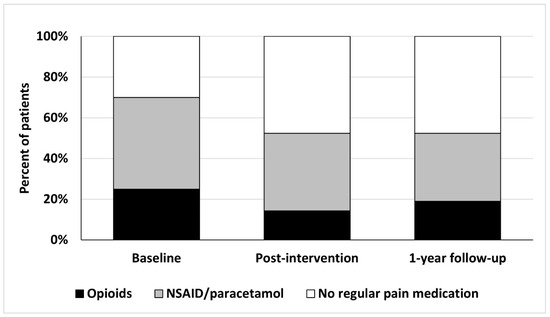 The percentage of all participants using opioids decreased from 25% (baseline) to 14% (post-intervention) and increased to 19% again at the 1-year post-intervention follow-up (Figure 2). About two-thirds (70%) of the participants used painkillers regularly at baseline. After the intervention, this figure improved to 48% and remained at that level at the 1-year follow-up.
