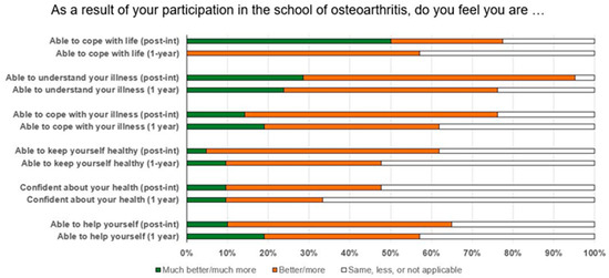 The Patient Enablement Instrument (PEI) was used to measure the extent to which a patient can understand and cope with his or her illness after an intervention [26]. The PEI consisted of six questions starting with “As a result of the osteoporosis school, do you feel you are …” followed by the alternative answers, where score 2 was for much better/much more; score 1 was for better/more; and score 0 was for same, less, or not applicable. The total score (range 0–12) was calculated for those participants who answered at least five questions. A higher score indicated higher enablement [26]. The Swedish version has been shown to have acceptable validity and reliability for patients with chronic pain [27,28].
