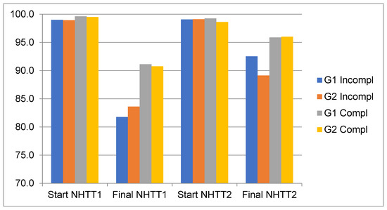 Figure 4 shows the evolution of the SatO2 of both groups in the two tests. It can be seen that in both groups, the values of SatO2 at the beginning of the first test are similar, decreasing more at the end of the first test in those who did not complete the NHTT1. At the beginning of the second test, the values of the four subgroups are similar, but at the end of the second test the percentage of arterial saturation decreases less in all of them.
