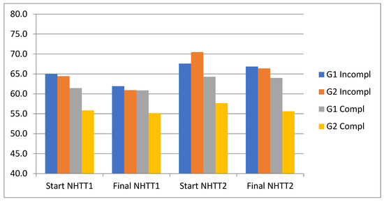 Evolution of SmO2 (%) in both test and subgroups. NHTT1: first normobaric hypoxia tolerance test; NHTT2: second normobaric hypoxia tolerance test; G1 incompl: group of parachutists with incomplete test; G2 Incompl: group of students with incomplete test; G1 Compl: group of parachutists with complete test; G2 Compl: group of students with complete test.