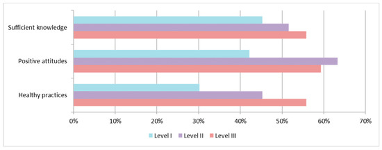Knowledge, attitudes, and practices of COVID-19 in the three different lockdown levels. Level I, not restricted; level II, partially restricted; level III, restricted.