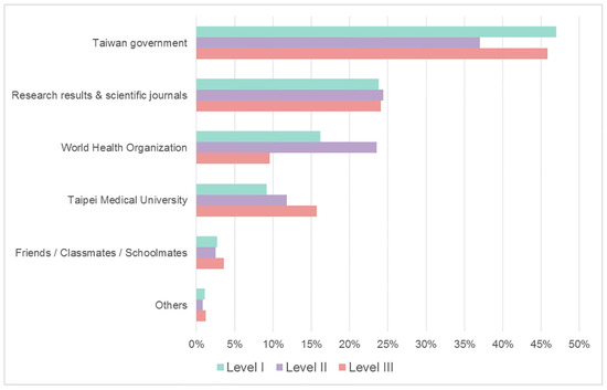 The most reliable information source is shown in Figure 3. There was a significant difference in the belief of the most reliable information among the five sources—the Taiwan government, research results and scientific journals, the World Health Organization (WHO), Taipei Medical University, and friends/neighbors/relatives (p < 0.001). The most reliable source was the Taiwan government, followed by research results and scientific journals. Friends/neighbors/relatives were the least reliable information source. The option “others” included private media from hometown, private media from Taiwan, and hearsay.