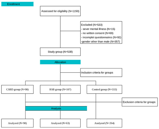 In order to compare differences in TP in men with CSBD, undertaking RSB and individuals without CSBD and RSB, the study included the three aforementioned groups. Common inclusion criteria for all subjects were an age of 18 or older and consent to participate in the study. Exclusion criteria included: confirmation of a diagnosis of serious mental illness (e.g., schizophrenia), dementia or mild cognitive impairment, dopaminergic therapy, failure to confirm written consent or withdrawal of consent to participate in the study, incomplete completion of the study questionnaire, preventing analysis. At this stage of the study, those declaring a gender other than male were also excluded. This was due to the fact that CSBD is more often diagnosed in men than in women, and initial inquiry indicated that almost exclusively men were attending therapies. However, we are currently collecting data on women, which requires more time and expanded collaboration with more centers. Table 1 presents group-specific inclusion and exclusion criteria and the diagram in Figure 1 shows the exclusion steps, along with their criteria.
