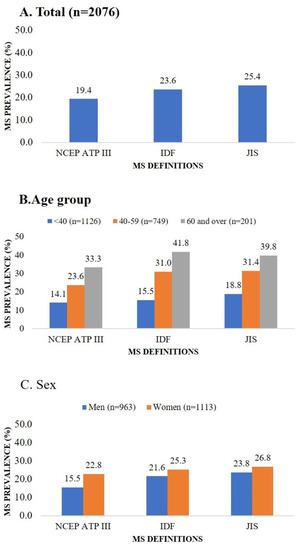 The overall prevalence rate of MS was 19.4% according to the NCEP ATP III, 23.6% according to the IDF, and 25.4% according to the JIS definitions. The prevalence of MS was higher in female participants and in the 40–59 and 60 and over age groups when stratified by sex and age (Figure 1).