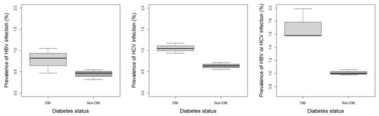 Prevalence of each hepatitis regarding the diabetes mellitus status. DM, diabetes mellitus; HBV, hepatitis B virus; HCV, hepatitis C virus.