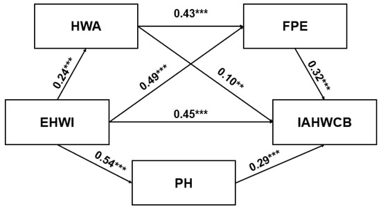 Hayes’s PROCESS macro (Model 4) was applied to test the mediation analysis of HWA, FPE, and PH on the relationship between EHWI and Chinese college students’ IAHWCB. This study then applied bootstrapping to obtain bias-corrected 95% confidence intervals to make statistical inferences about specific indirect effects [69]. In the first mediation model, HWA positively predicted IAHWCB (β = 0.10, p < 0.01). In addition, EHWI positively predicted IAHWCB (β = 0.43, p < 0.001). The mediation effect test showed an indirect effect of EHWI on IAHWCB, mediated by HWA (β = 0.02, p < 0.001, 95% CI [0.01, 0.05]). Therefore, the indirect effect was significant, and the partial mediation effect of HWA was confirmed. The second mediation model’s result indicated that FPE positively predicted IAHWCB (β = 0.32, p < 0.001). Meanwhile, EHWI positively predicted IAHWCB (β = 0.27, p < 0.001). The mediation effect test showed an indirect effect of EHWI on IAHWCB, mediated by FPE (β = 0.19, p < 0.001, 95% CI [0.13, 0.25]). Therefore, the indirect effect was significant and the partial mediation effect of FPE was confirmed. The third mediation model demonstrated that PH positively predicted IAHWCB (β = 0.29, p < 0.001). Furthermore, EHWI positively predicted IAHWCB (β = 0.30, p < 0.001). The mediation effect test showed an indirect effect of EHWI on IAHWCB, mediated by PH (β = 0.16, p < 0.001, 95% CI [0.10, 0.22]). Thus, the indirect effect was significant, and the partial mediation effect of PH was confirmed.