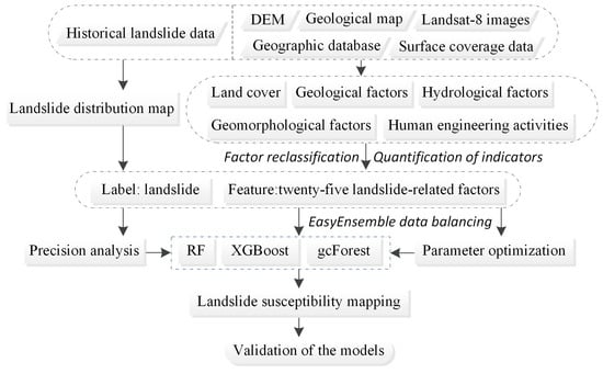 Each of the three ensemble methods, bagging, boosting, and stacking, has multiple models. This article uses three representative models with the ensemble methods for landslide susceptibility prediction: an RF with bagging, the XGBoost model with boosting, and the gcForest model with stacking.