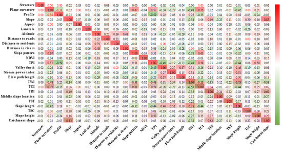 SAGA-GIS software was used to extract the valley depth, flow path length, catchment slope, distance to rivers, SPI, and TWI under hydrological conditions from SRTM1 DEM data. The distance to rivers, distance to residences, and distance to roads were obtained using 1:25 million national basic geographic databases to establish a buffer zone. The NDVI was obtained by calculations of the Landsat-8 image, the land use type was derived from the 30-metre global land cover data, and the geological structure was obtained from the geological map data. ArcGIS 10 software was used to extract the landslide impact factor layer and the landslide layer to the vector points and make them easy to analyse. The data set included 2,131,599 rows (number of grids) and 26 columns (25 factors and landslide data). Bivariate correlation analysis in SPSS software was used, and the Pearson correlation coefficient was used to calculate the correlation coefficient matrix of 25 landslide-influencing factors (Figure 3). Most of these 25 factors displayed low correlation coefficients, and the linear correlations between these factors were weak. Therefore, the 25 landslide impact factors were incorporated into the landslide susceptibility evaluation system to build the probability prediction model of landslide occurrence.