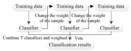 The boosting algorithm [23] first uses the training set and initial weights to train weak learner 1. A weak learner refers to a learner with generalisation performance slightly better than that for a random guess [24]. Usually, different weights are assigned according to the classification accuracy, and the samples with low accuracy are given higher weights [25]. The samples with higher weights are considered by subsequent learners. Weak learner 2 is trained according to the training samples after adjusting the weights. The above steps are repeated t times to generate T base classifiers. The boosting framework algorithm assigns weights and fuses the N base classifiers to produce an improved classification result. After weighted fusion by the weak learners, the data are typically reweighted to strengthen the classification of previously misclassified data points. During the training of the boosting algorithm, the classifier is trained based on the samples with errors in the previous classification step, such that the algorithm can reduce the classification error rate of the model; as the training process progresses, the training set is increasingly correctly classified, and the variance of the model increases (Figure 6). However, the random sampling of features for training can reduce the correlation between submodels, thereby reducing the variance of the overall model [26].
