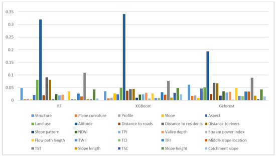 Feature importance measures the contribution of each input feature to the prediction results of a model and highlights the degree of correlation between a feature and the target. In this paper, the importance of 25 factors was calculated for the three tested models. The test results show that the altitude, TST, distance to residences, distance to rivers and land use are the main factors that affect landslide susceptibility (Figure 8).