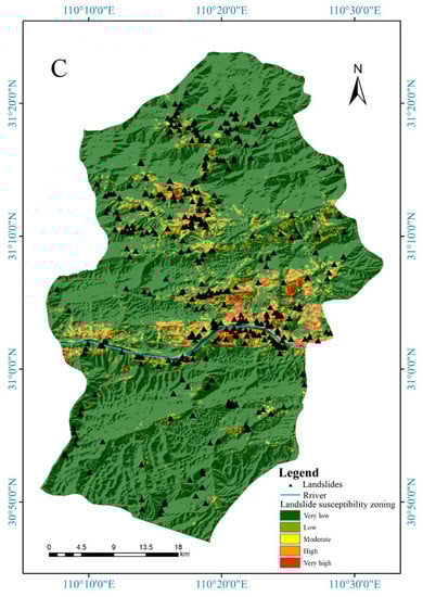 Landslide susceptibility zoning maps produced by three ensemble models: (A) RF model, (B) XGBoost model, and (C) gcForest model.