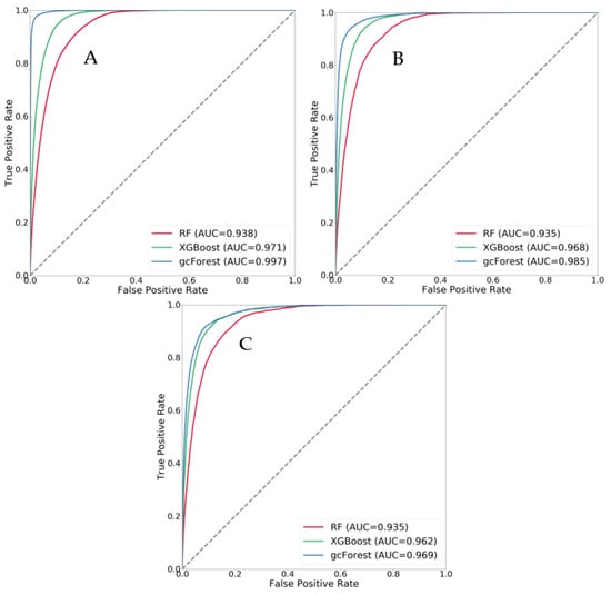 ROC curves of all data for different grid sizes ((A) 30 m, (B) 60 m, and (C) 90 m).