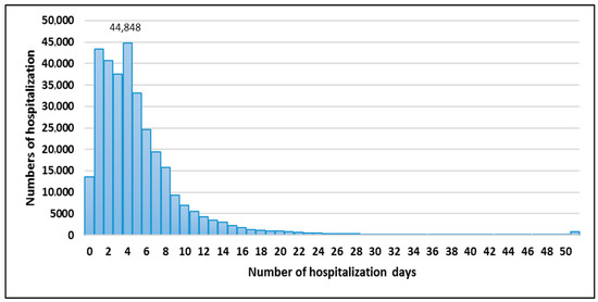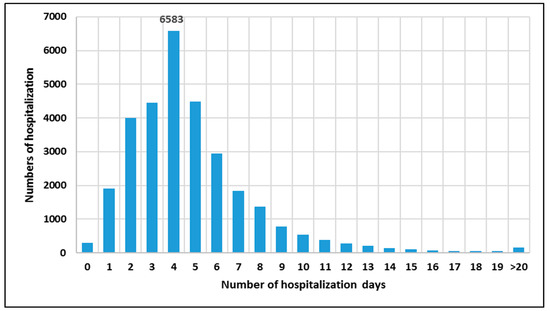 The largest number of re-hospitalisations (44,848) among patients not covered by CCMI, as with those included in the programme, was 4 days long. The second-largest group of re-hospitalisations was 1-day hospital stays (43,372), followed by 2-day hospital stays (40,745). Longer stays were the least frequent type of re-hospitalisations (Figure 2).