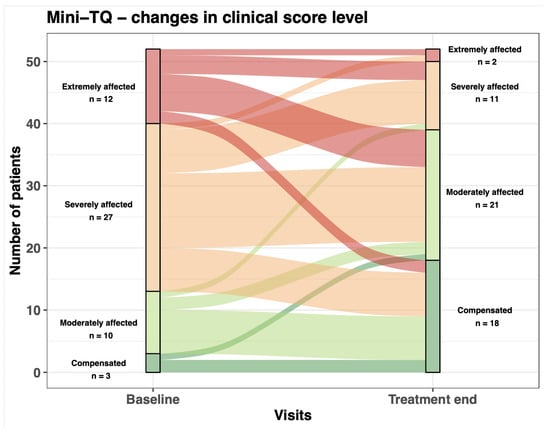Based on the Sankey plot, as shown in Figure 1, the number of patients who were extremely and severely affected was reduced from baseline to treatment end. Accordingly, the number of patients who were moderately affected or compensated increased. Based on the CGI at treatment end, all patients except two (n = 1: no change; n = 1: very much worse) showed an amelioration of their symptoms (n = 13: very much better; n = 19 much better; n = 16: minimally better). For two patients, we had no information. The effects were comparable during the follow-up visit (n = 13: very much better; n = 14 much better; n = 18: minimally better; n = 2: no change; n = 1: very much worse; n = 4: no information).