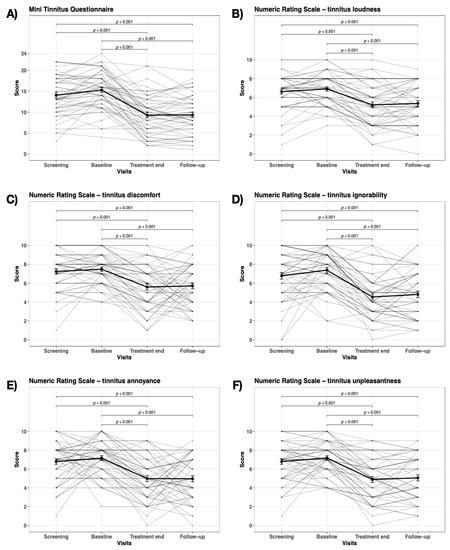 Changes in the tinnitus ratings. Changes in the tinnitus ratings over the four visits with cognitive behavioral therapy taking place between the baseline and the treatment end for the different measures of the tinnitus burden.