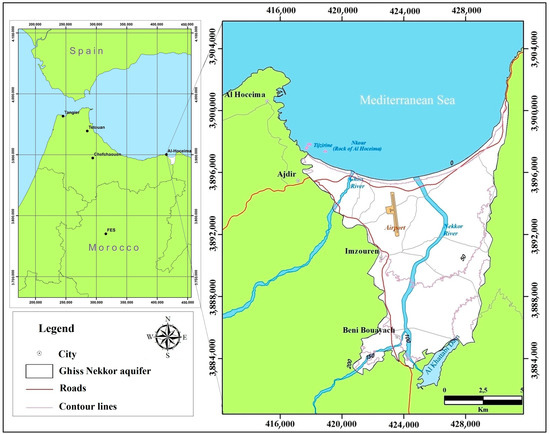 The project site belongs to the Rif chain, where the principal geological formations encountered surrounding the Ghiss Nekkor alluvial aquifer are the limestones (Lias-Cretaceous) of the internal dorsal, the marls and sandstones of the Ajdir aquifer, and alluvium and silts of the Middle and Recent Quaternary [44,45]. The studied region includes two main units: Ghiss and Nekkor; the Ghiss Nekkor watershed comprises a moderately dense hydrographic network oriented from the south to the north that shelters the Mediterranean Sea. The main rivers that drain the study area are the River Ghiss and the River Nekkor. The global geometric configuration of the Ghiss Nekkor watershed is presented in Figure 2.