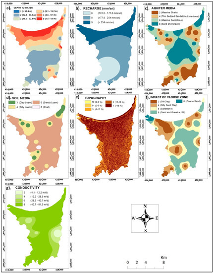 Maps showing the integration of (a) depth to water, (b) recharge, (c) aquifer media, (d) soil media, (e) topography (slope), (f) impact of vadose zone, and (g) conductivity.