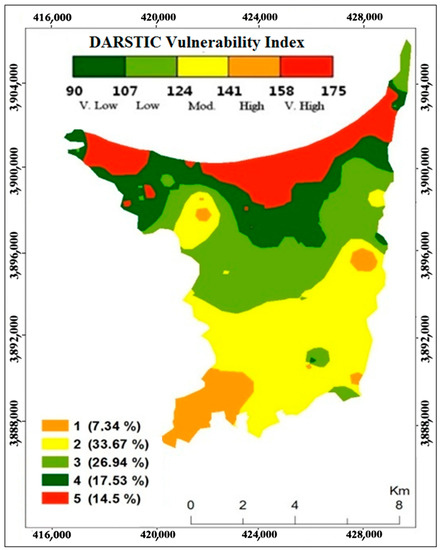 The resulting value is a relative measurement of vulnerability to pollution; areas with a high rate index are considered more vulnerable than those with a significantly lower value. The parameter rates and weights used in the original DRASTIC approach are described in Persson et al. [23].