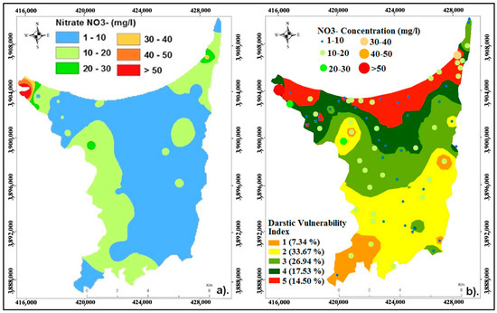 (a) Nitrate concentration distributions in the groundwater of Ghiss Nekkor, (b) vulnerability map and concentrations of nitrates for the study zone.